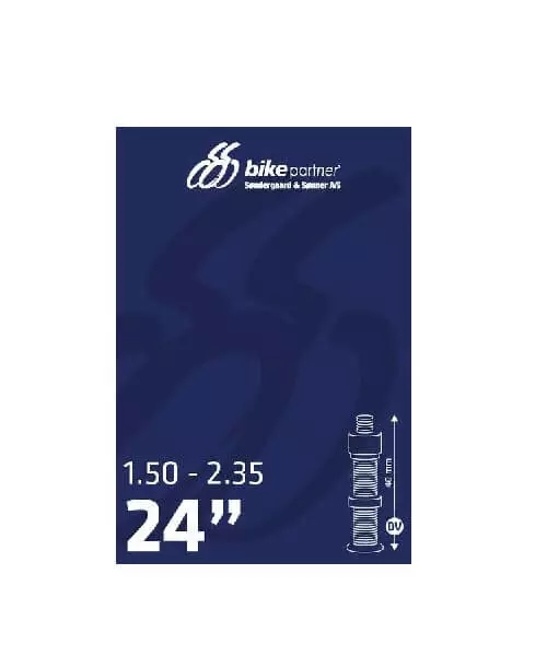 BikePartner cykelslange til cykler med 24” hjul. Slangen har almindelig cykelventil – Dunlop-ventil og passer i dæk med størrelsen 24 x 1,50 – 2,35”.