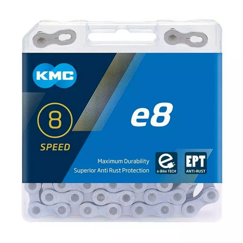 KMC e8 8 speed kæde med EPT anti rust behandling og X-Bridge design som sikrer et hurtigt og præcist gearskifte.