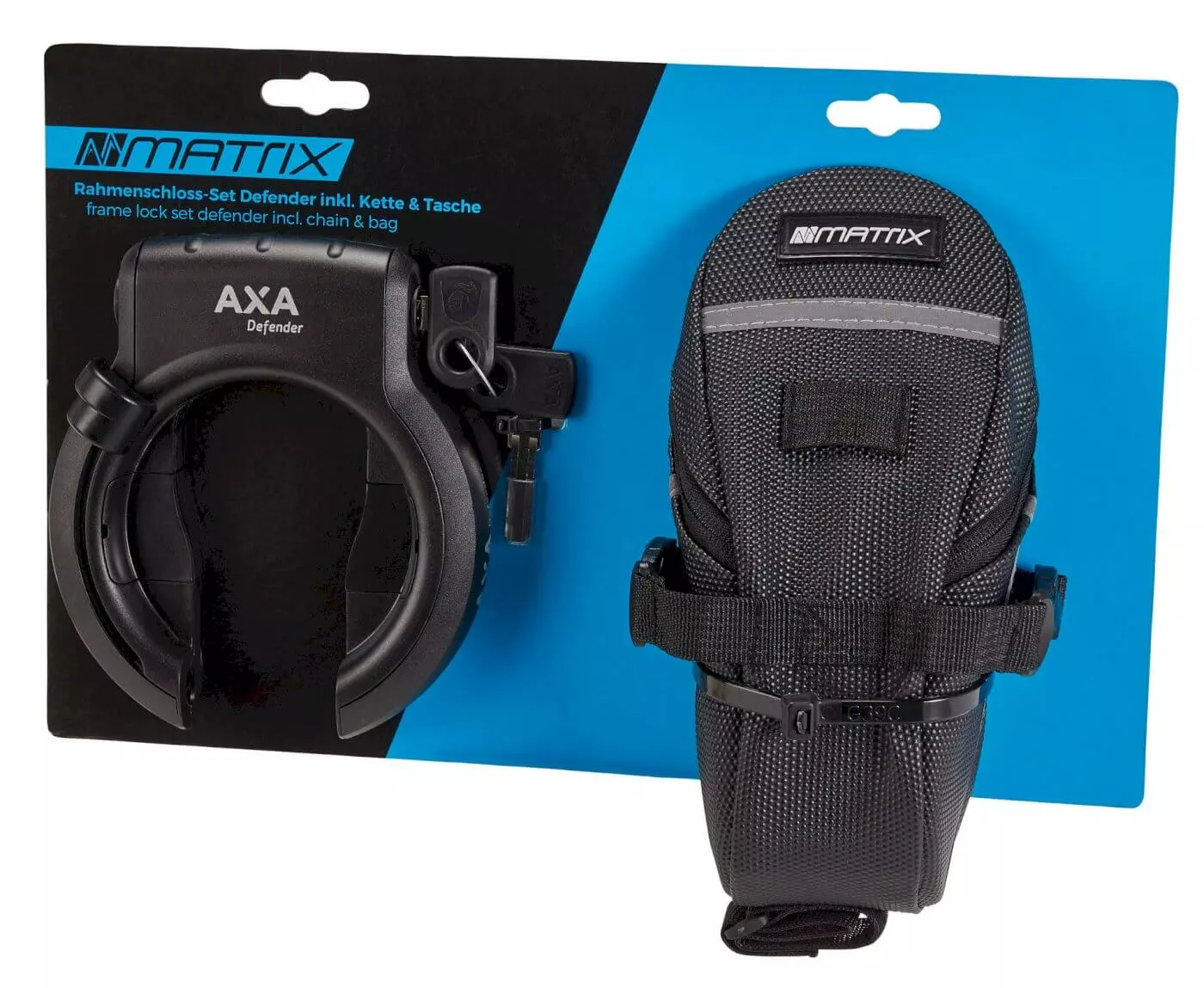 Matrix Defender låsesættet består af to cykellåse. En ringlås til montering på cyklen og en plug-in kæde som låser cyklen fast til en fast genstand som et skilt, træ eller cykelstativ. Sættet giver det den bedste sikring af din cykel.