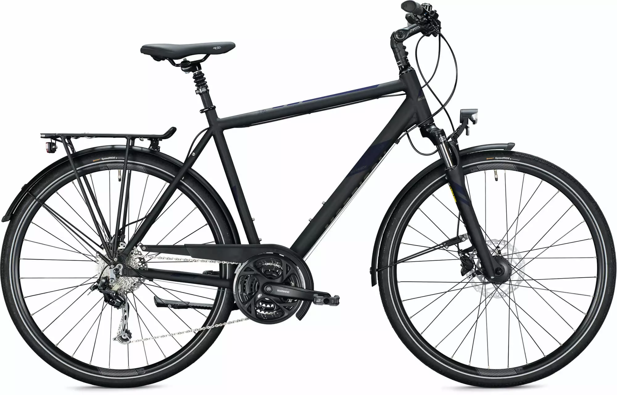 Morrison T 3.0 har 28” hjul og let rullende Continental dæk, 24 udvendige Shimano gear, hydrauliske skivebremser og affjedret forgaffel og sadelpind som giver dig komfort og kontrol på dårlige og ujævne veje. Samtidig er cyklen udstyret med navdynamo og kraftigt lysende LED cykellygter, skærme og bagagebærer.