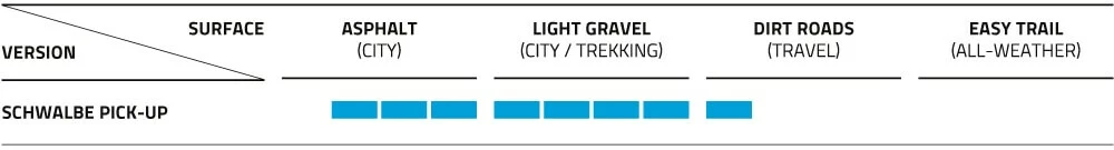 Schwalbe Pick-Up er Schwalbes første dæk specifikt målrettet cargocykler. På grund af sin ekstremt stabile karkasse bliver Schwalbe Pick-Up en rigtig pakkehest og giver samtidig fremragende punkteringsbeskyttelse. Derudover sikrer ADDIX E-Compound enestående god køreegenskaber og greb..