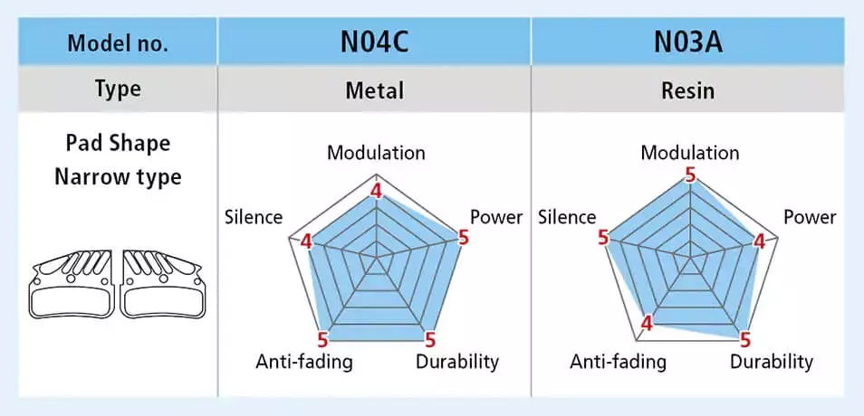 Med resin bremsebelægning som giver god modulering af bremsekrafen og nærmest ingen støj.